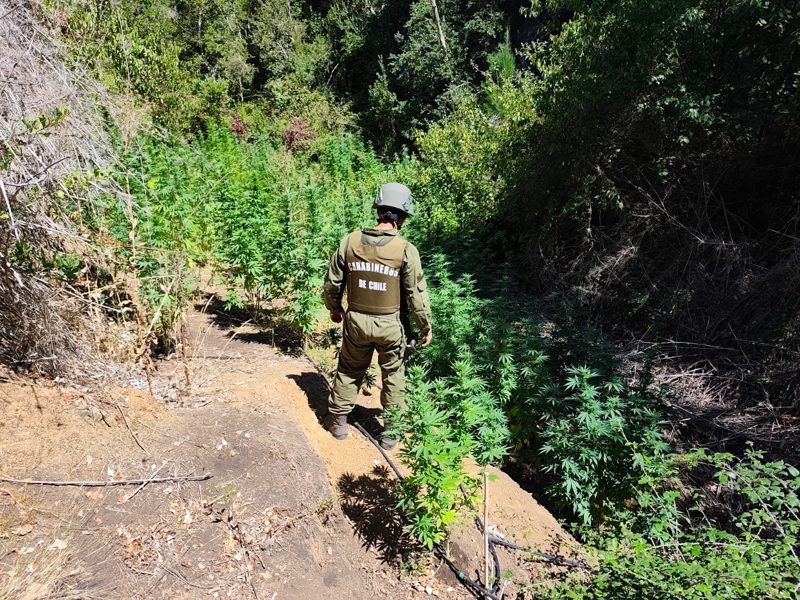 La plantación distribuida en 5 canchas de cultivo artesanal, se encontraba en un sector de difícil acceso que requirió que el personal realizara un recorrido de infantería durante más de 3 horas, para llegar a la ubicación de los cultivos que se encontraban entre las quebradas.