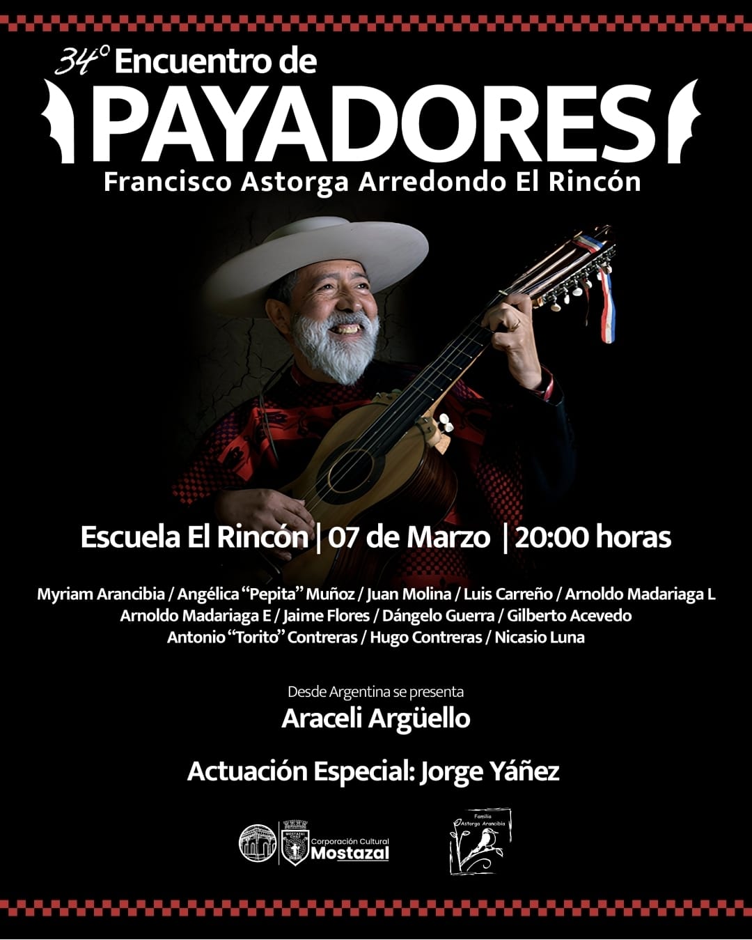 La comuna de Mostazal disfrutará el próximo sábado 7 de marzo el XXXIV Encuentro de Payadores Francisco Astorga Arredondo de El Rincón, en una cita cultural de más de tres décadas reuniendo destacados cultores de payas y del canto, provenientes de distintas regiones de Chile y Latinoamérica.