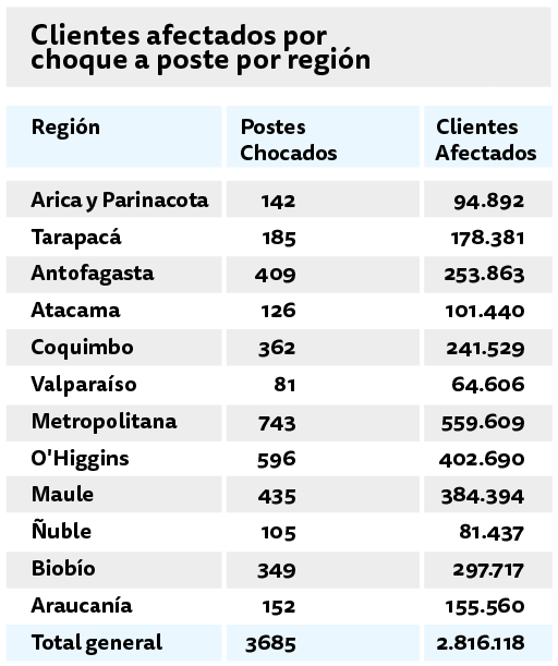 Le sigue la región de O´Higgins, con 402.690 clientes afectados; Maule con 384.394; Biobío con 297.717; Antofagasta con 253.863 y Coquimbo con 241.529 clientes afectados en su suministro por postes chocados. Más atrás se ubican Arica y Parinacota, Tarapacá, Atacama, Valparaíso, Ñuble y Araucanía (ver tabla).