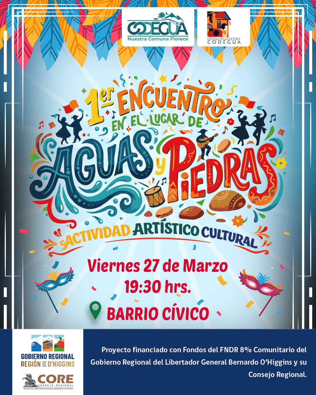 El “1er Encuentro en el lugar de Aguas y Piedras” es financiado a través del Fondo FNDR 8% Comunitario del Gobierno Regional de O’Higgins y su Consejo Regional, consolidándose como una instancia que invita a la comunidad a reunirse, celebrar y ser parte activa de la vida cultural de Codegua.
