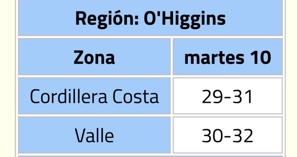 Particularmente en O’Higgins, se proyecta que en la zona de la cordillera de la costa las temperaturas oscilen entre los 29 y 31°, en tanto en el valle se pronostican 30 a 32° de máxima.