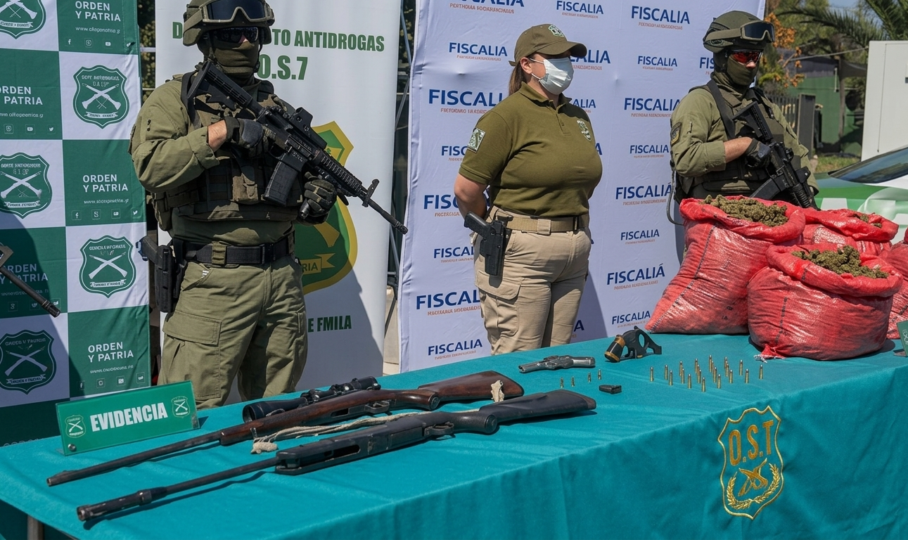 El procedimiento, coordinado por la fiscalía local de Rengo, se extendió por cuatro días e incluyó apoyo del Gope O’Higgins y dos helicópteros de la prefectura aérea. Junto a la droga, se decomisaron armas de fuego —dos revólveres, un rifle calibre .22 y un rifle de aire comprimido— y se detuvo a R.A.D.T, chileno, de 67 años, con antecedentes penales, sin orden vigente de aprehensión, por el delito de porte y tenencia de armamento y munición.