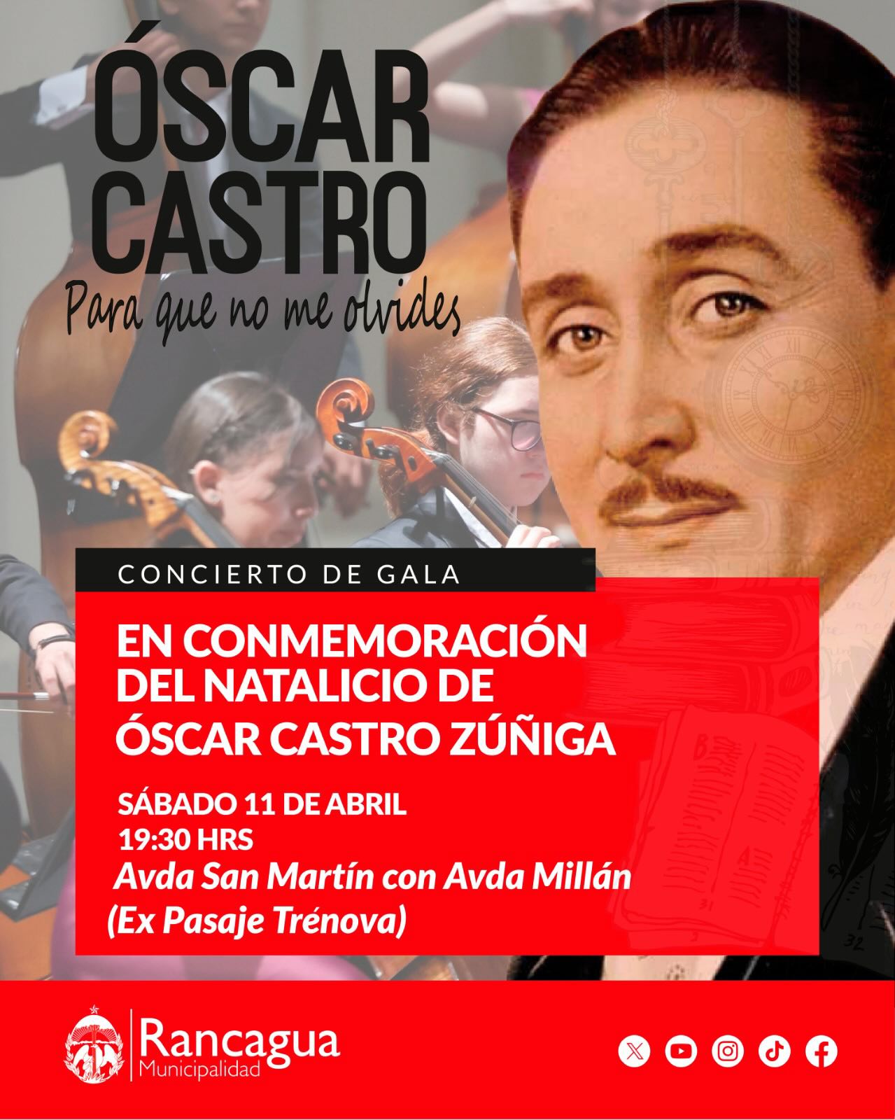 Rancagua se prepara para vivir una especial jornada cultural este sábado 11 de abril, en el marco de la conmemoración del natalicio del poeta Óscar Castro Zúñiga. La actividad central será el concierto de gala “Para que no me olvides”, que se desarrollará a partir de las 19:30 horas en Avenida San Martín con Avenida Millán, en el sector del ex Pasaje Trénova.