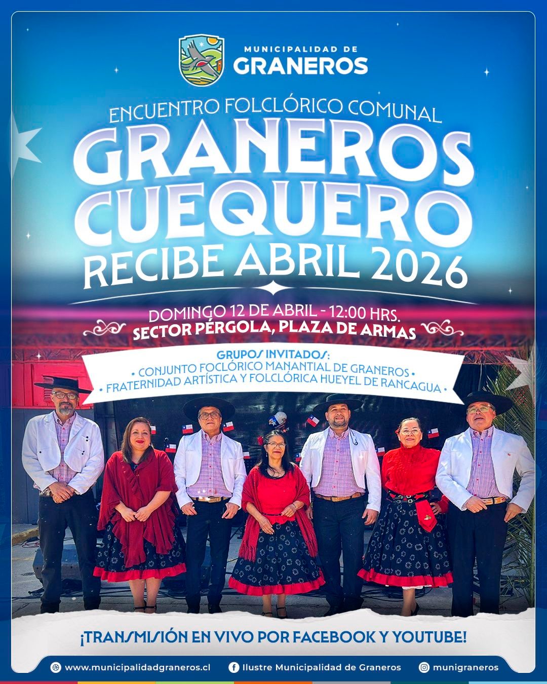 De acuerdo a lo informado por la Municipalidad de Graneros, la actividad se desarrollará a partir de las 12:00 horas en el sector Pérgola de la Plaza de Armas, lugar donde los pañuelos comenzarán a alzarse al ritmo de la música folclórica.