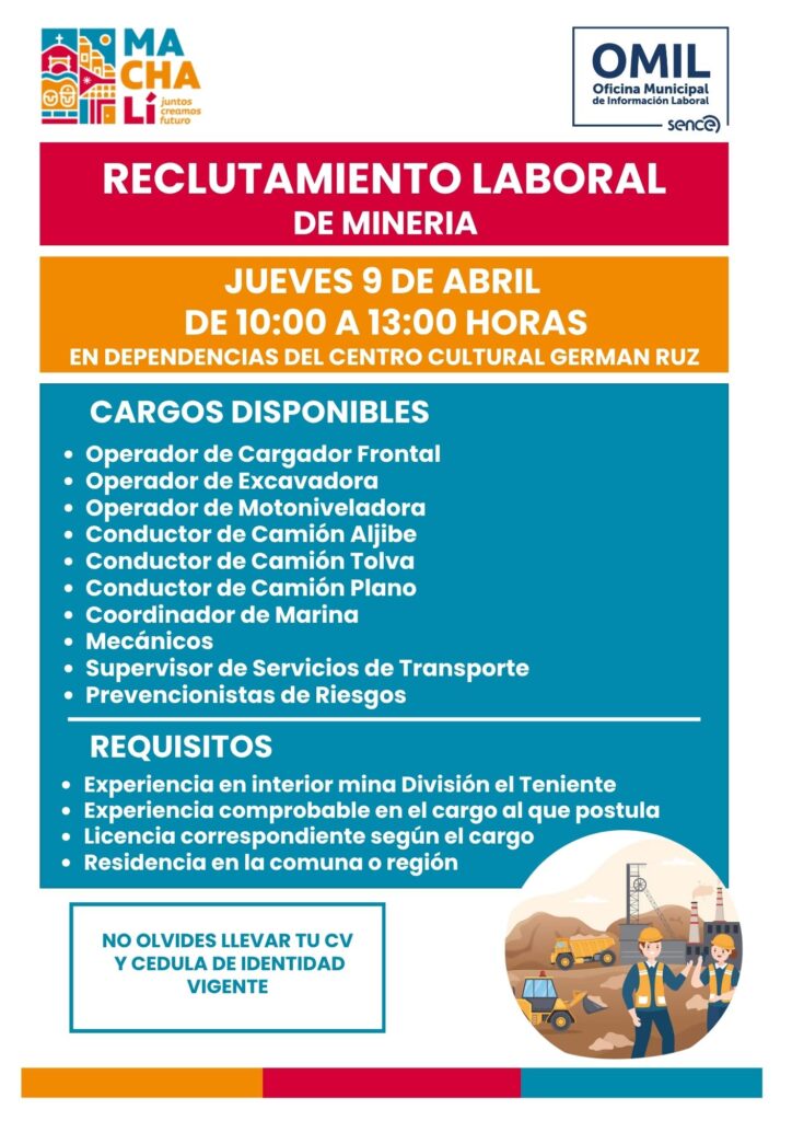 La actividad se realizará el jueves 9 de abril, entre las 10:00 y las 13:00 horas, en el Centro Cultural Germán Ruz de la comuna. La convocatoria se desarrolla en conjunto con una empresa del rubro minero y está enfocada en cubrir distintos puestos relacionados con operaciones en faena.