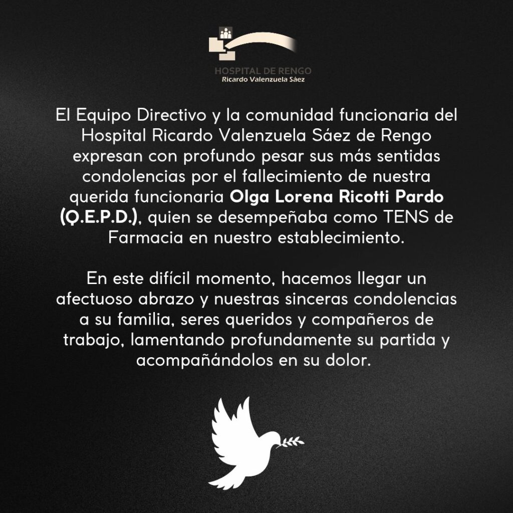 El Hospital de Rengo informó la tarde de este domingo el fallecimiento de una funcionaria vinculada al área de farmacia, mediante una publicación difundida en sus plataformas oficiales cerca de las 17:00 horas.