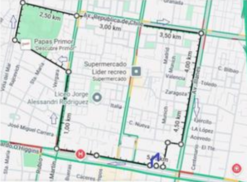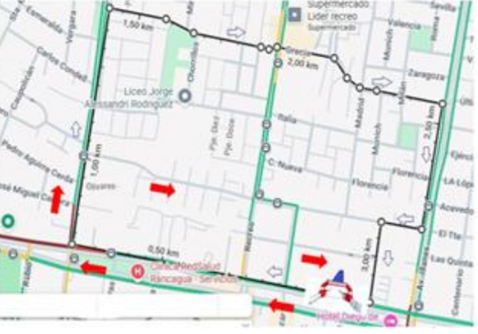 En el caso del circuito de 3K, el trayecto considera el desplazamiento por la Alameda en dirección poniente por la calzada norte hasta Avenida España, para luego continuar por distintos tramos urbanos como Avenida Grecia, Illanes y calles aledañas, retornando finalmente al recinto deportivo.