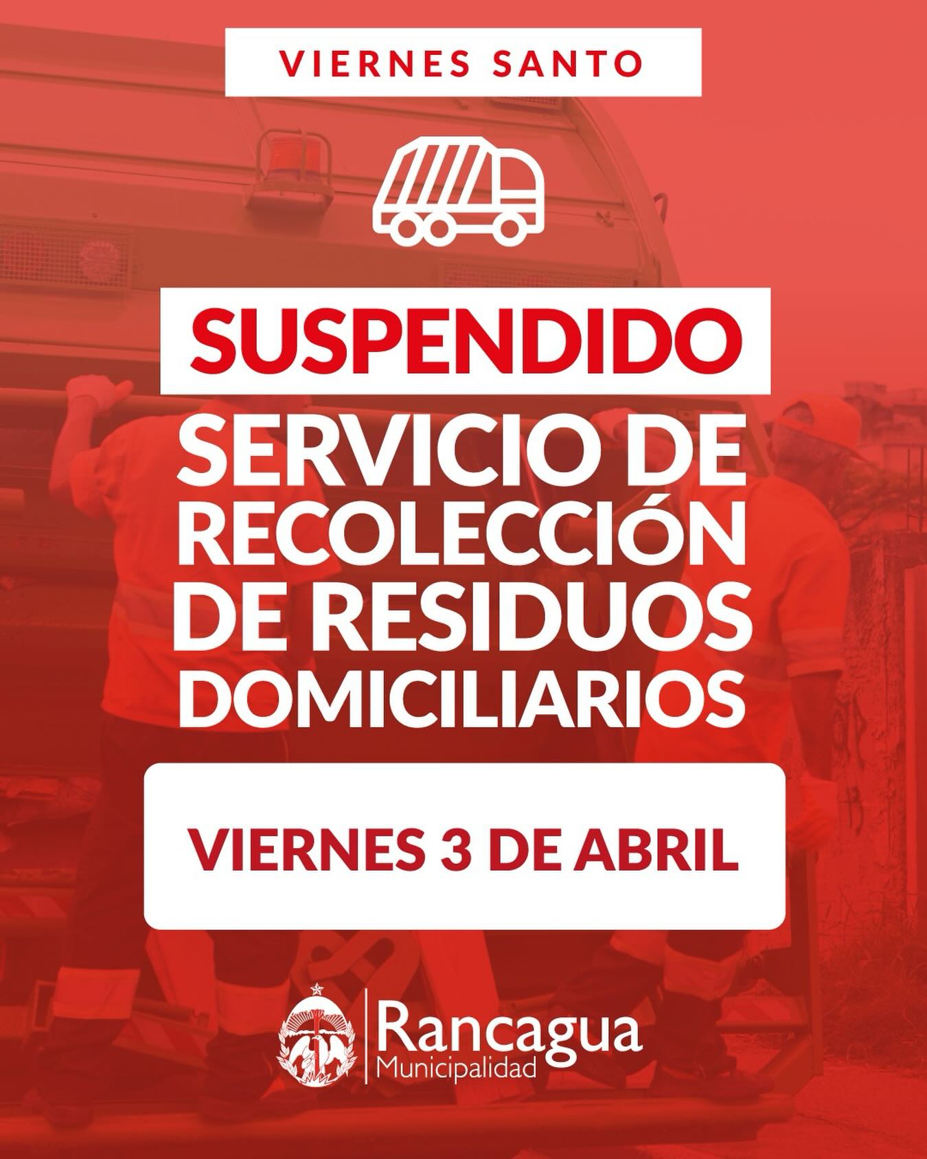 La Municipalidad de Rancagua informó que este viernes 3 de abril el servicio de recolección de residuos domiciliarios estará suspendido en la comuna, en el marco del feriado por Viernes Santo.