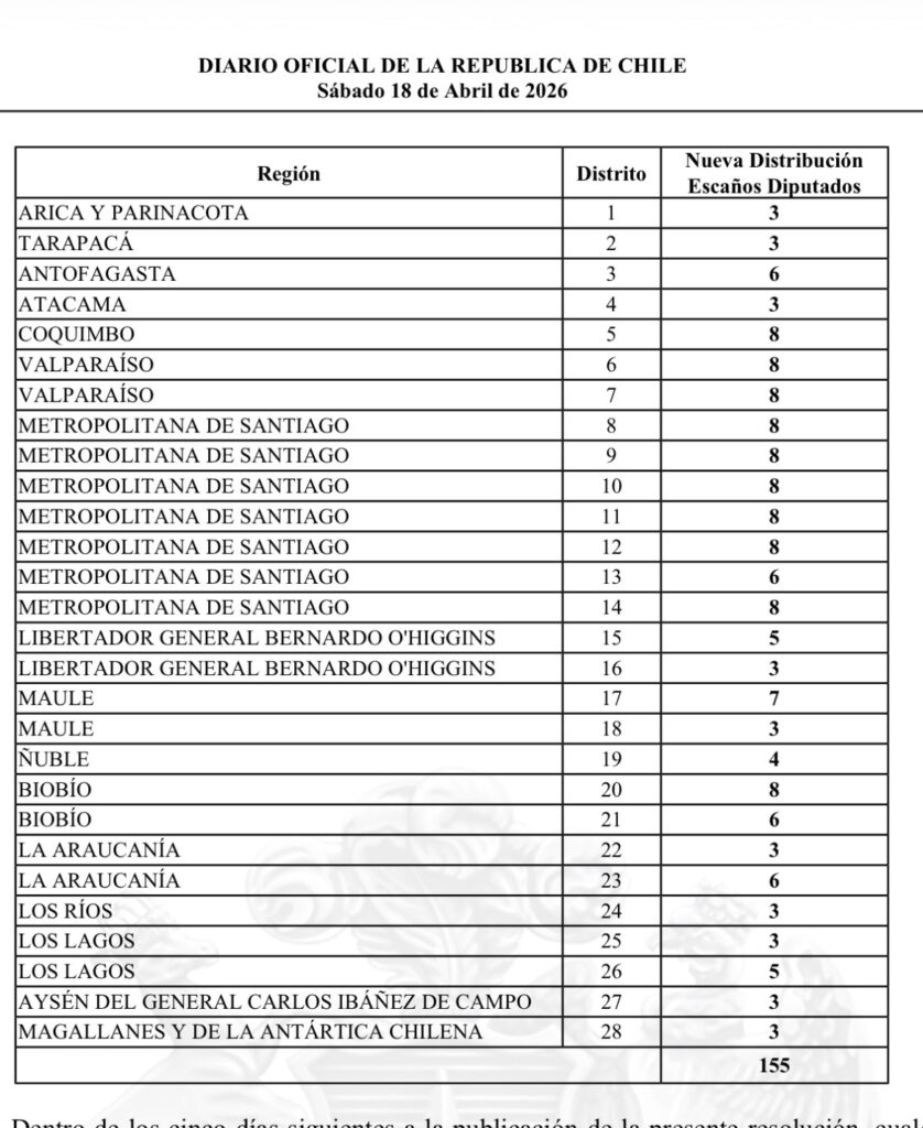A través de la Resolución N°0129 -con fecha 16 de abril- el Servicio Electoral (Servel) actualizó la distribución de los 155 escaños de la Cámara de Diputados, en línea con los resultados del Censo 2024.