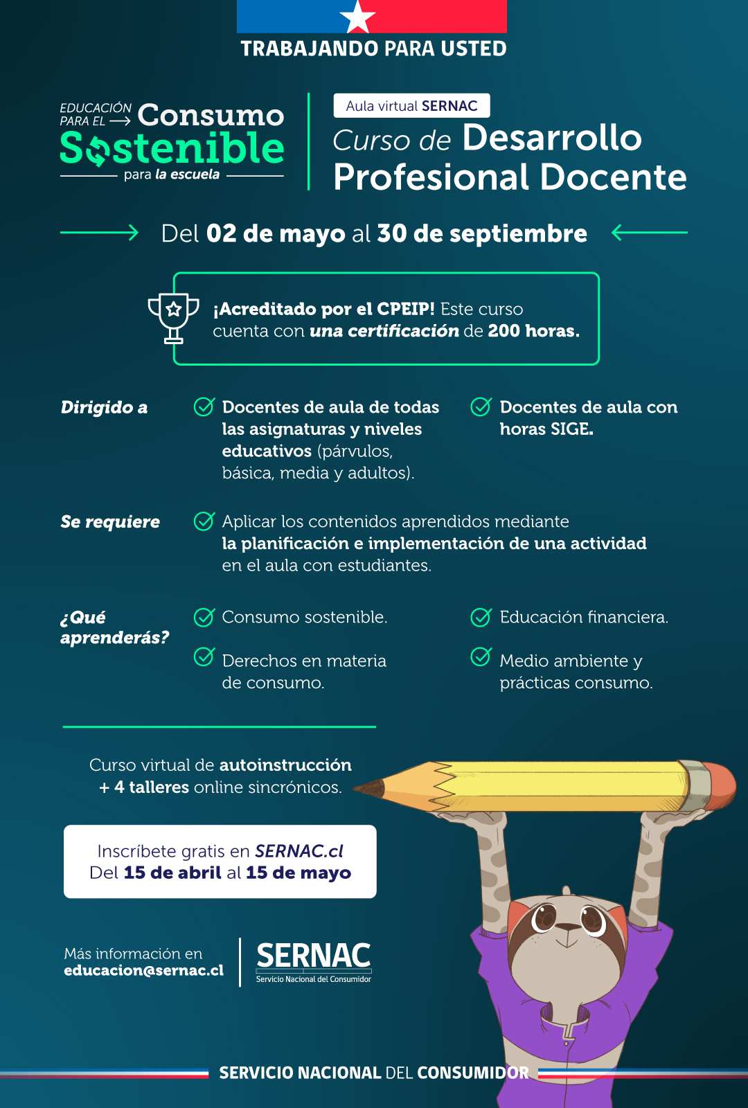 El Sernac abrió las matrículas para el curso 2026 “Educación para el Consumo Sostenible en la Escuela”, disponible completamente en modalidad virtual. La capacitación busca que los docentes de aula de todas las asignaturas y todos los niveles educativos (párvulos, básica, media y adultos) incorporen contenidos sobre consumo responsable, educación financiera, medio ambiente y prácticas de consumo, entre otros, para luego transferirlos a sus estudiantes de acuerdo al contexto de cada establecimiento.