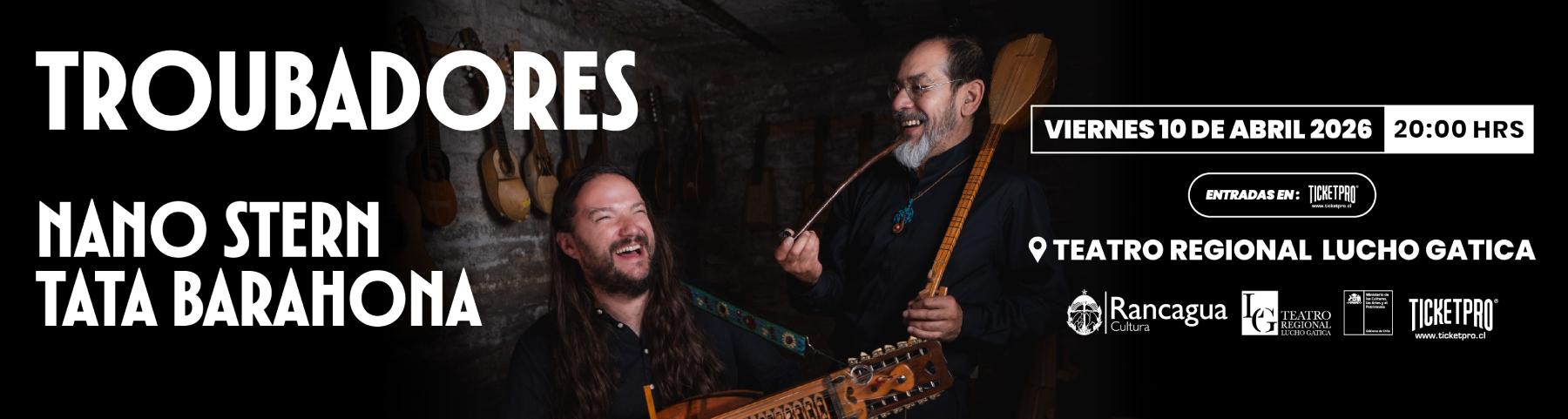 La música también tendrá su espacio con el concierto “Troubadores”, donde Nano Stern y Tata Barahona se presentarán este viernes a las 20:00 horas en el Teatro Regional Lucho Gatica, en un espectáculo íntimo que mezcla trova, improvisación y sonidos de raíz. Las entradas están disponibles en Ticketpro.